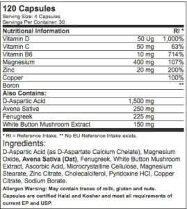 Mixed feelings about this product… It certainly has some known and recognised t-boosting ingredients in the mix, but it does seem to be a little underpowered… the form of magnesium used is a cheaper and weaker type, and key components such as Vitamin D and DAA are found in relatively small doses especially when compared to some of our top rated products..