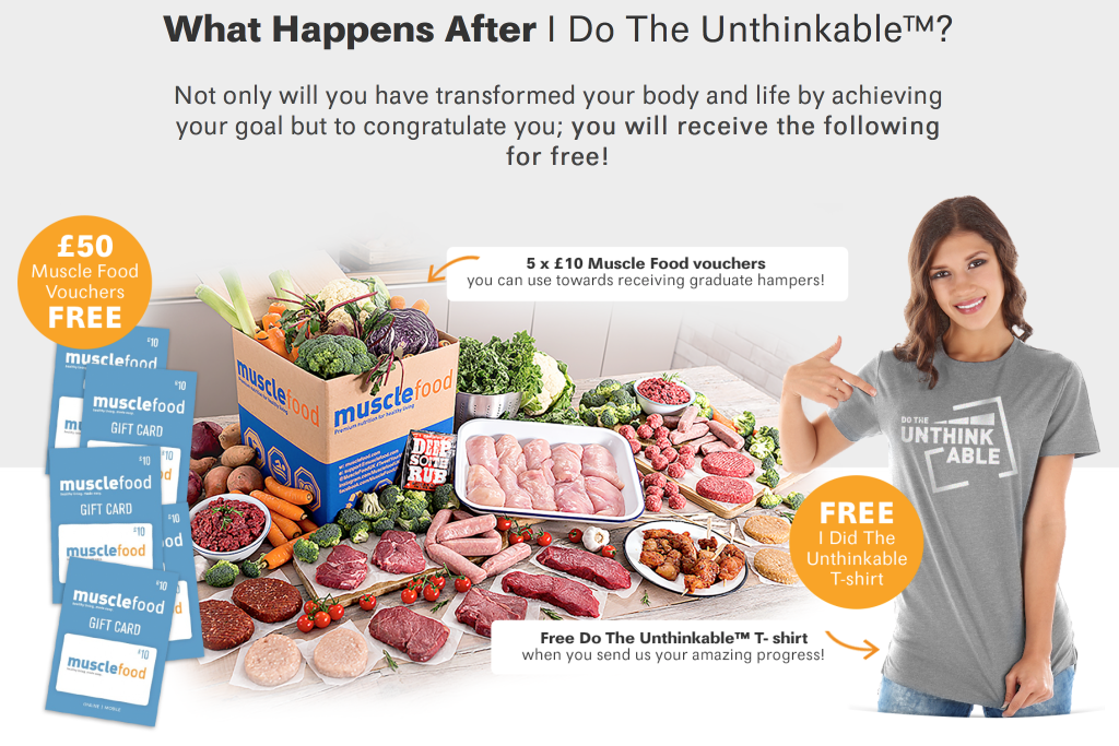 Not only will you have seen a complete body transformation. As an extra reward after completing The Unthinkable program, Musclefood will send you musclefood vouchers worth £50. You will also receive their special “I did the Unthinkable’ tee shirt.